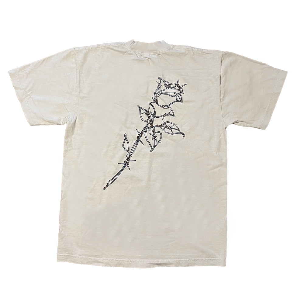 Barbed wire rose illustration by Kane Navasard printed on a 100% cotton tee. Color: Cement.